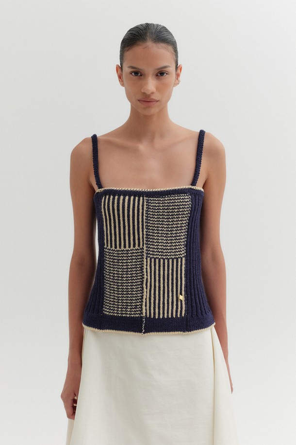 텍스처 슬리브리스 니트 탑 - 네이비/베이지