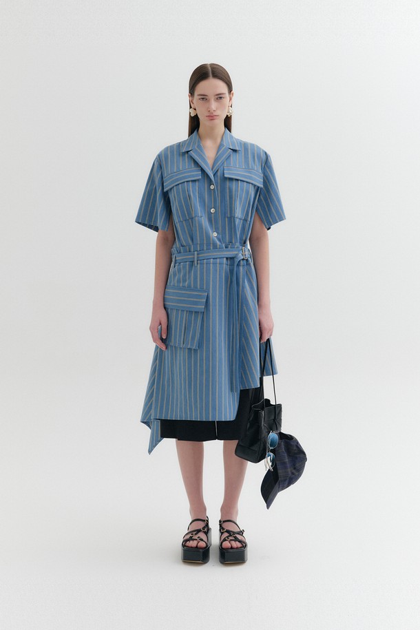 벨티드 로우 웨이스트 셔츠 드레스 - 블루