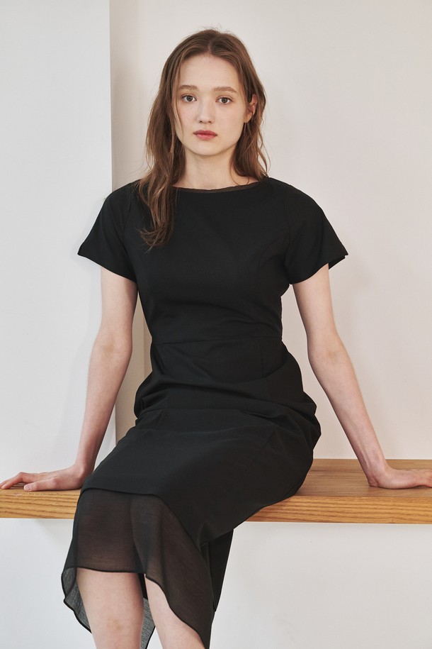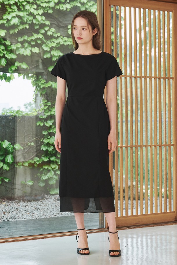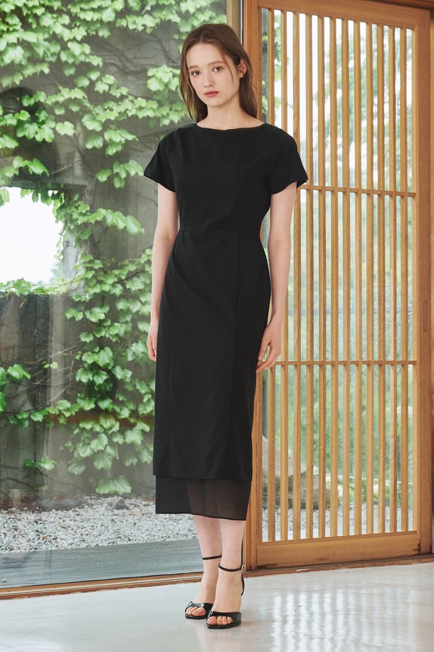 보트넥 쉬폰 레이어드 드레스 - 블랙 / Boat Neck Chiffon Layered Dress - Black