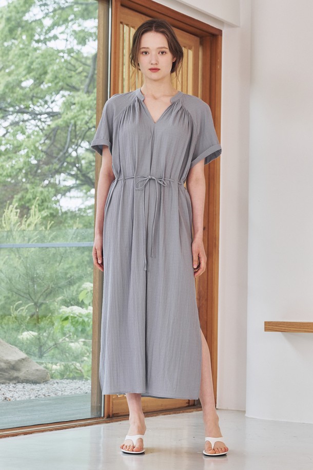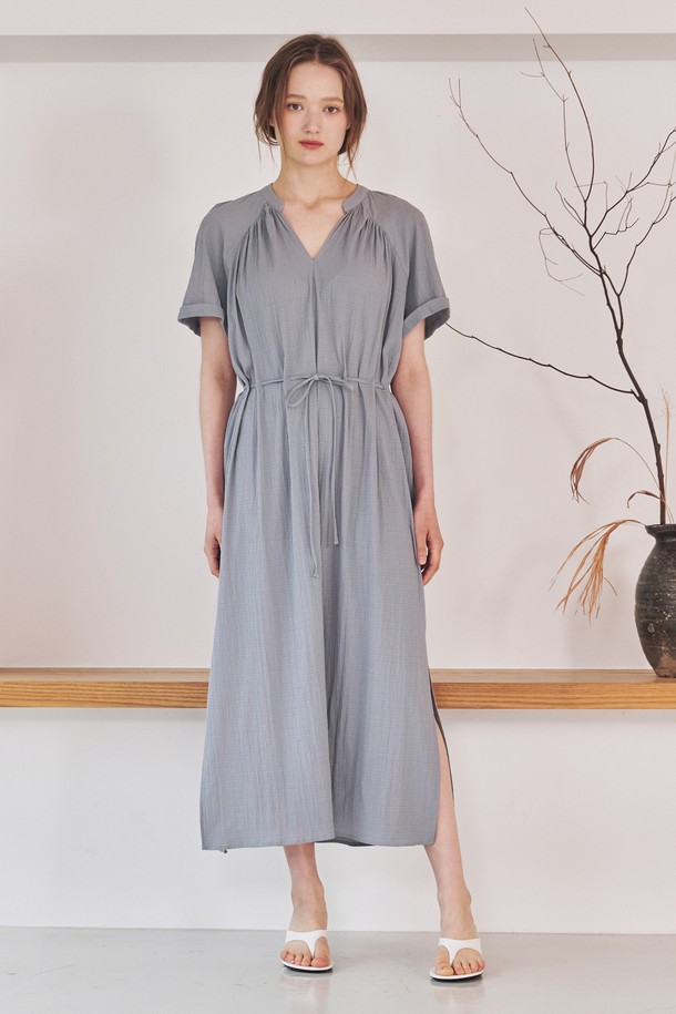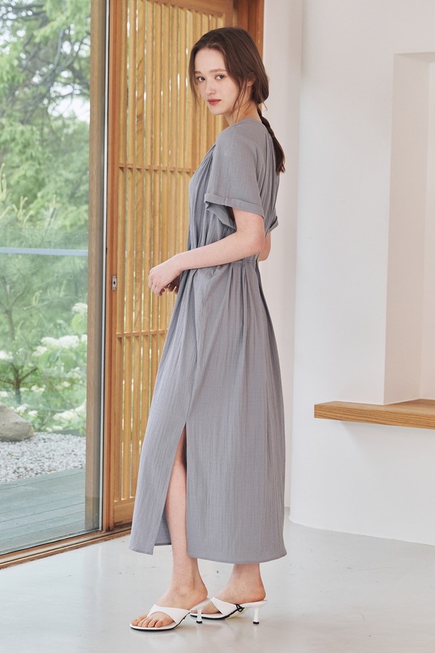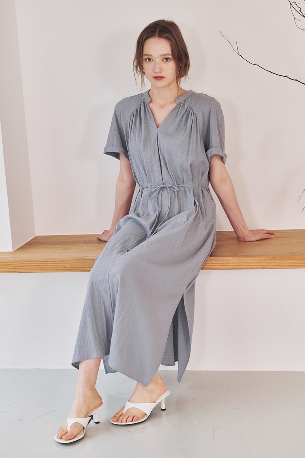 브이넥 셔링 드레스-블루 / V-Neck Shirring Dress - Blue