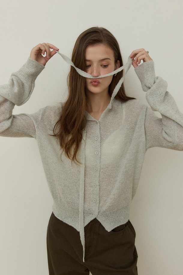 Fluffy yarn ribbon neck loose fit cardigan - melange grey
