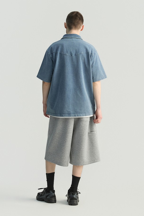 JARETH 데님 텍스쳐 버튼 카라 숏 슬리브 티셔츠