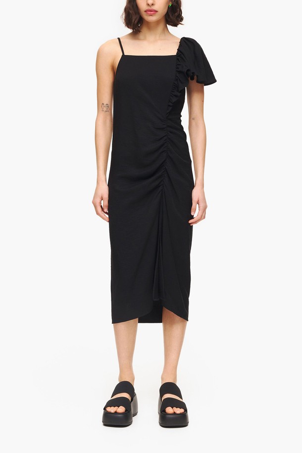 [23SS] 빔바이롤라 블랙 깅엄 체크 러플 드레스 B235JWO022BKB는 봄, 여름 시즌 우아하고 유니크한 스타일을 연출하는 여성 드레스입니다. 블랙 컬러의 레이온 및 나일론 혼방 소재로 제작되어 부드러운 촉감을 선사하며, 언밸런스 핏과 스퀘어 넥, 언밸런스 네크라인 디자인이 특징입니다. 깅엄 체크 패턴과 러플, 셔링 디테일이 로맨틱한 무드를 더하며, 민소매 또는 반소매 디자인으로 시원하게 착용할 수 있습니다. 일상, 파티, 모임, 데이트 등 다양한 TPO에 활용 가능하며, 클래식, 로맨틱, 시크한 스타일을 완성합니다.