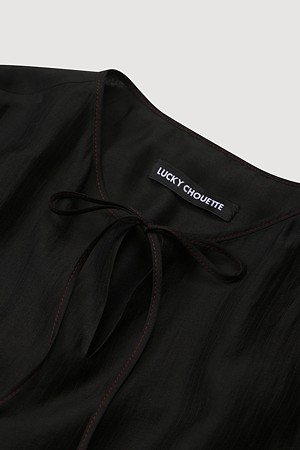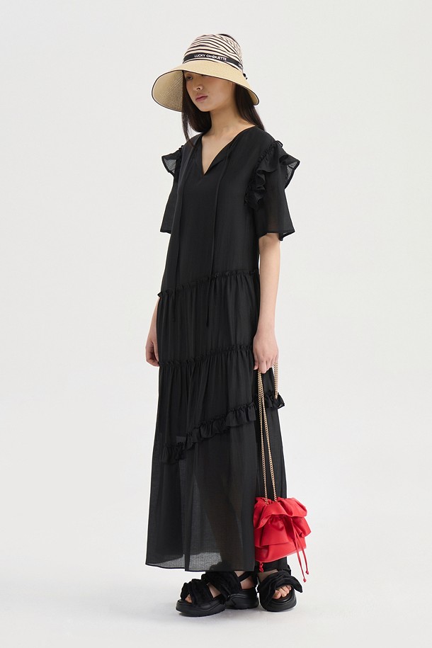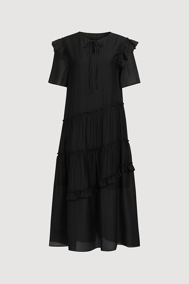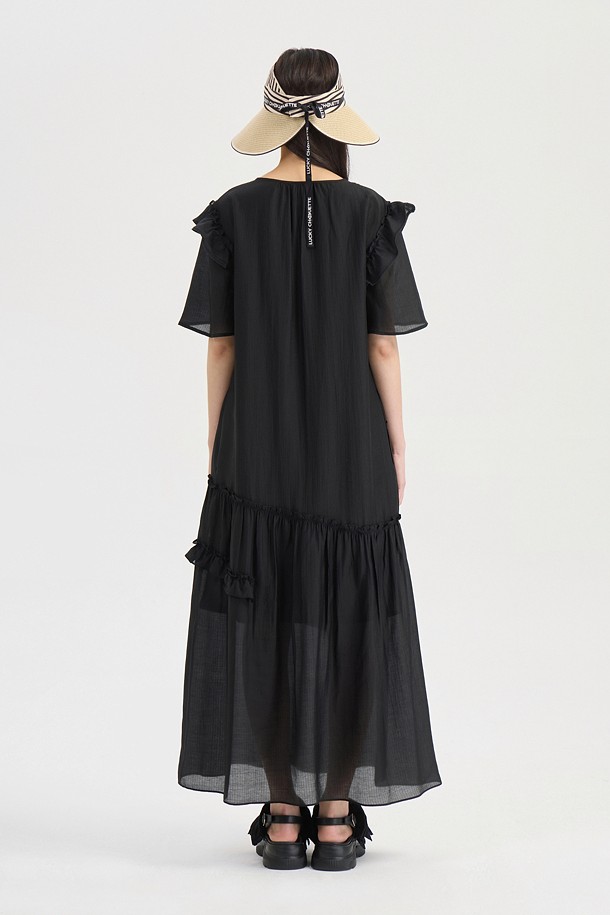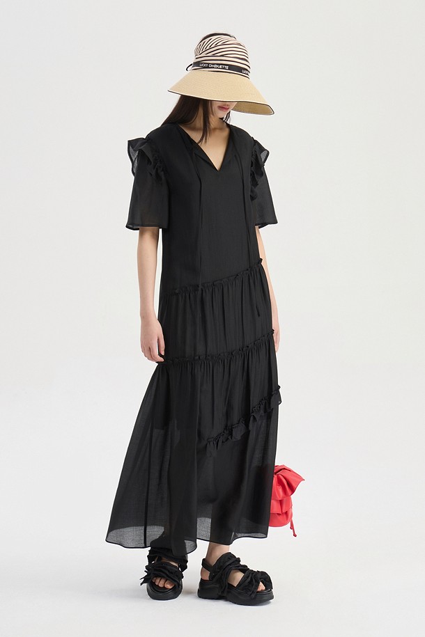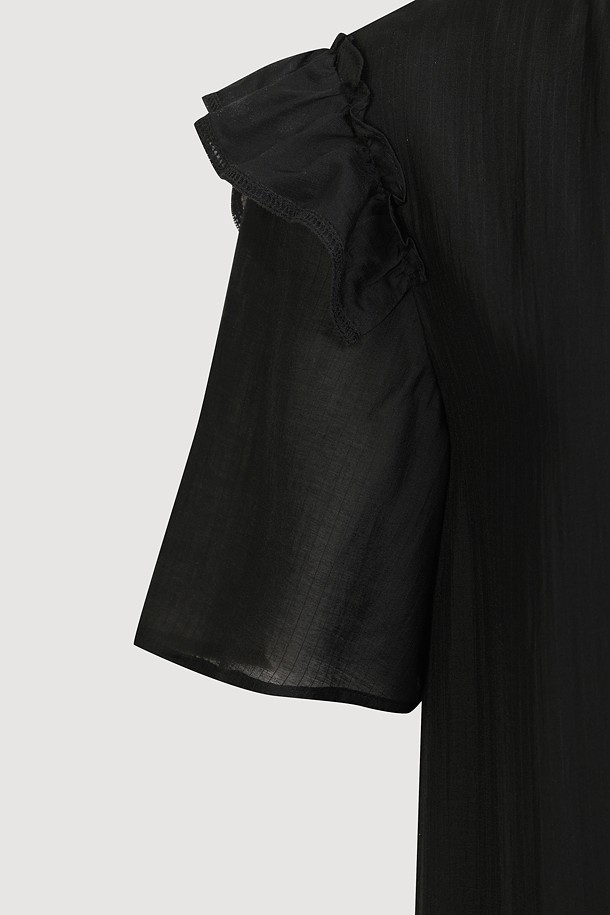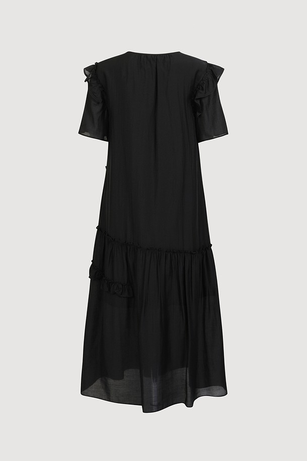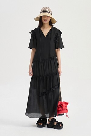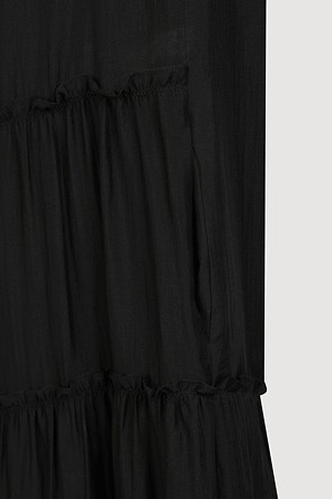 Pin stripe Shirring Short Sleeve Long Dress (black)