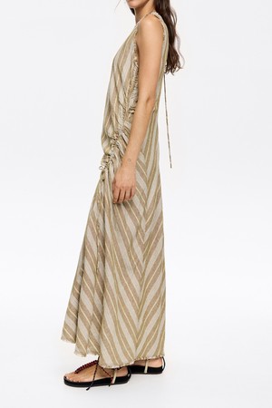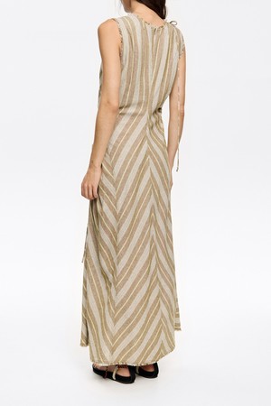 [25SS] 빔바이롤라 올리브 프레이드 린넨 믹스 맥시 드레스는 린넨 53%와 레이온 47% 혼방 소재로 제작되어 시원하고 편안한 착용감을 선사합니다. 올리브 컬러의 스트라이프 패턴과 민소매, 라운드넥 디자인이 특징이며, 프레이드 디테일로 포인트를 더해 자연스러우면서도 세련된 스타일을 연출합니다. 일상에서 편안하게 즐길 수 있는 맥시 기장의 드레스입니다.