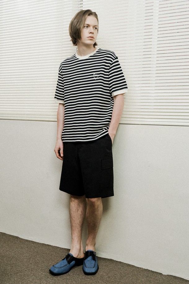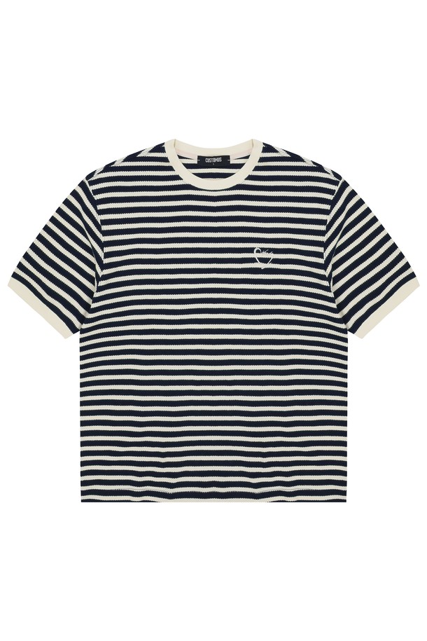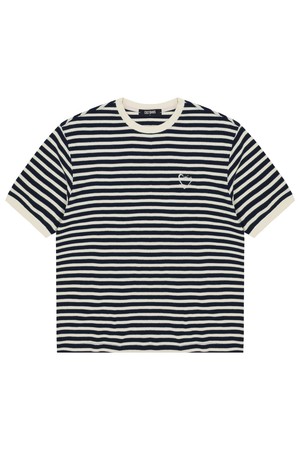 [커스텀어스] 선염스트라이프 하트로고자수 라운드 반팔티셔츠 CXS24MKRT414 NAV