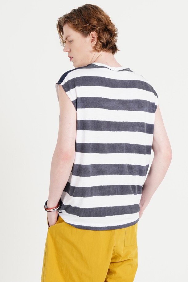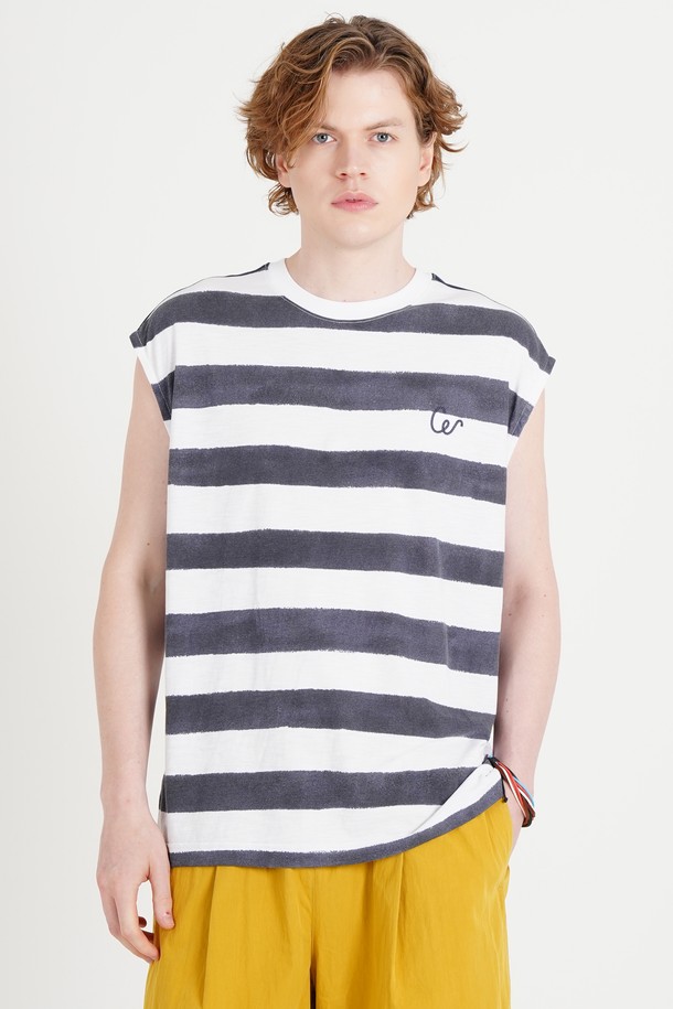 [커스텀어스] 로고자수 스트라이프 남자 슬리브리스 티셔츠 CXS25MKTO704 NAV