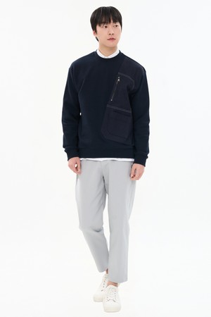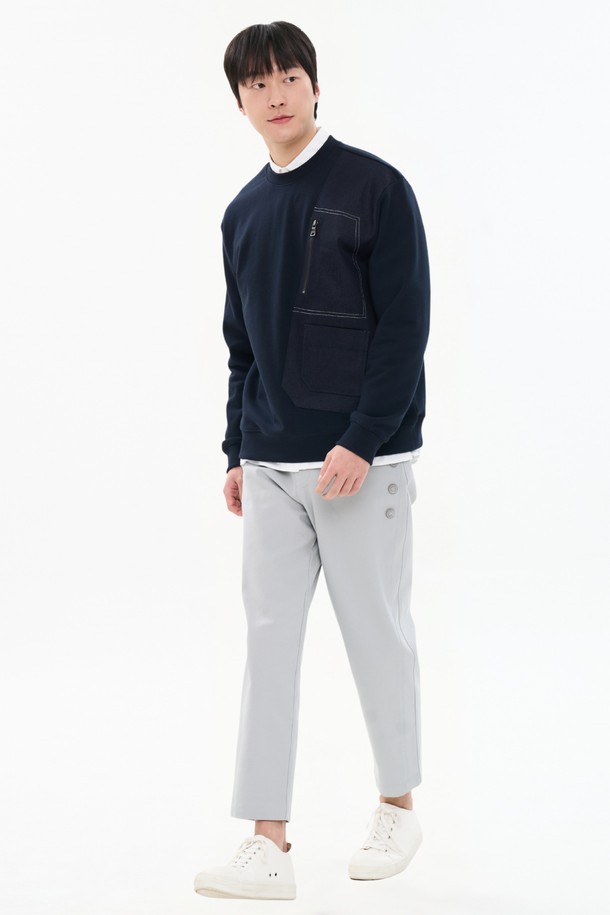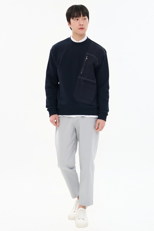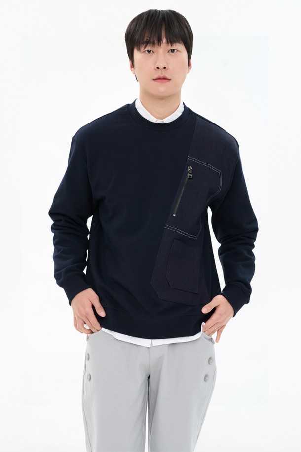 남자 데님 패치워크 배색 맨투맨 지퍼포켓 오버핏 스웨트셔츠 CXS26SKMT202 NAV