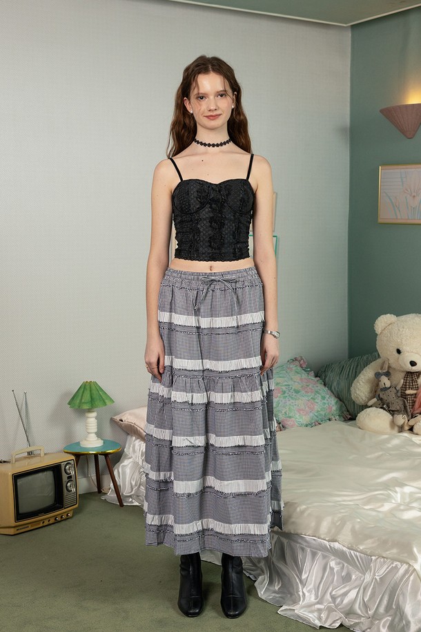Layered lace check cake skirt_GRAY