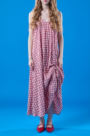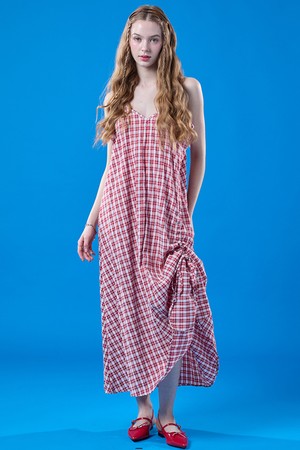 쿨링 브이넥 프레피 여름 맥시 체크 나시원피스 [RED]