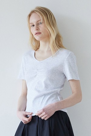 프런트 셔링 반팔티셔츠 - 화이트 멜란지