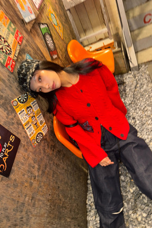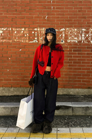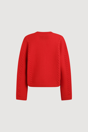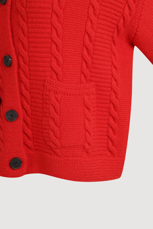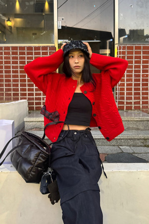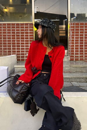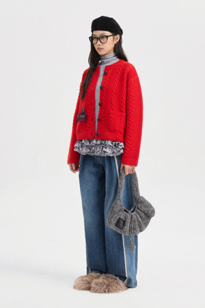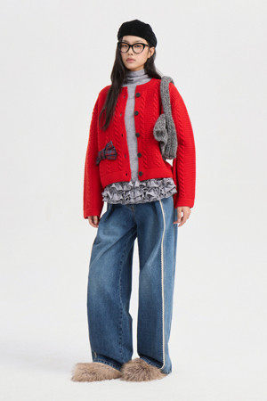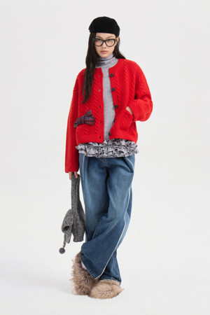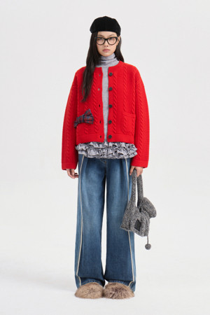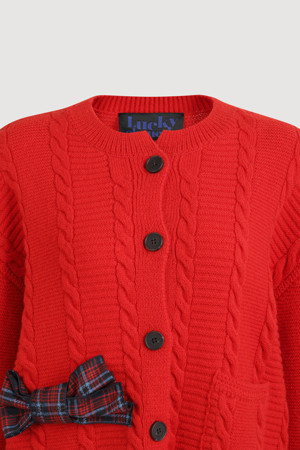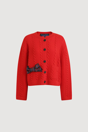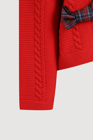 [Re-Order] Check Ribbon Round Neck Knit Cardigan (red)