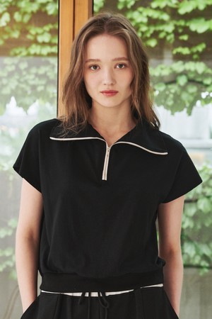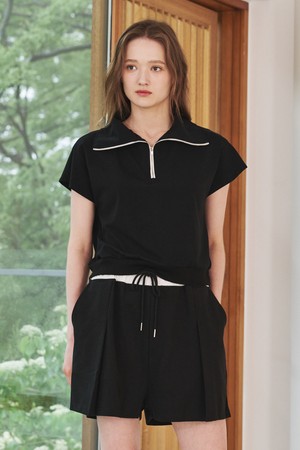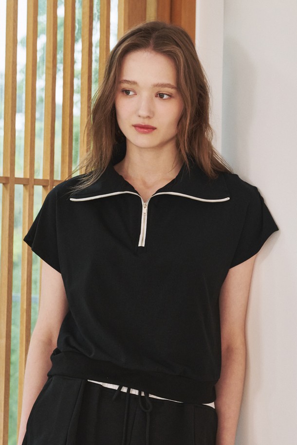 캡 슬리브 하프 집업 티셔츠 - 블랙 / Cap Sleeve Half Zip Up T-Shirts - Black