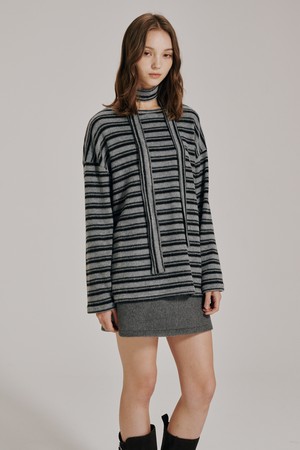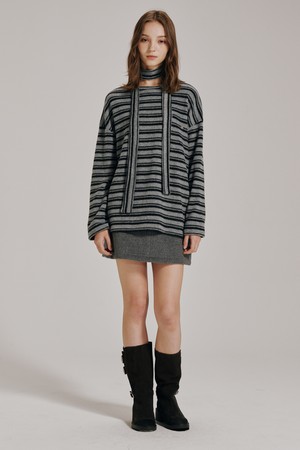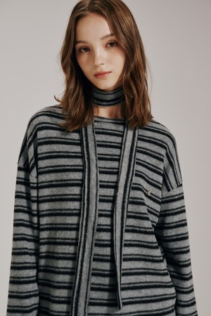 스트라이프 스카프 니트 티셔츠 - 그레이 / Stripe Scarf Knit T-Shirt - Gray