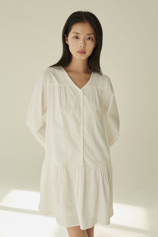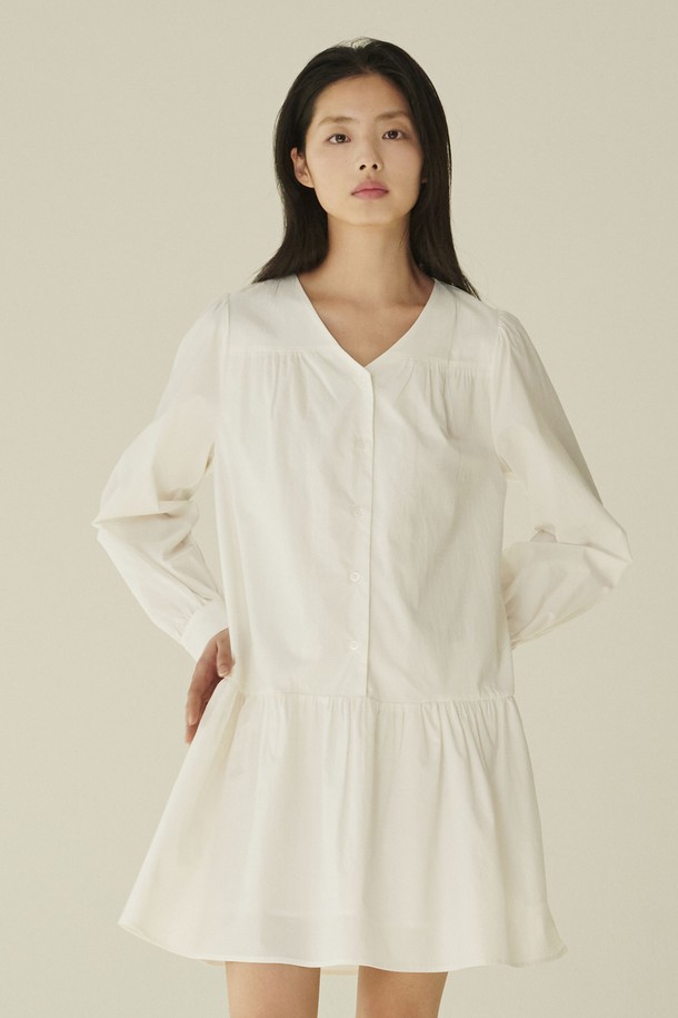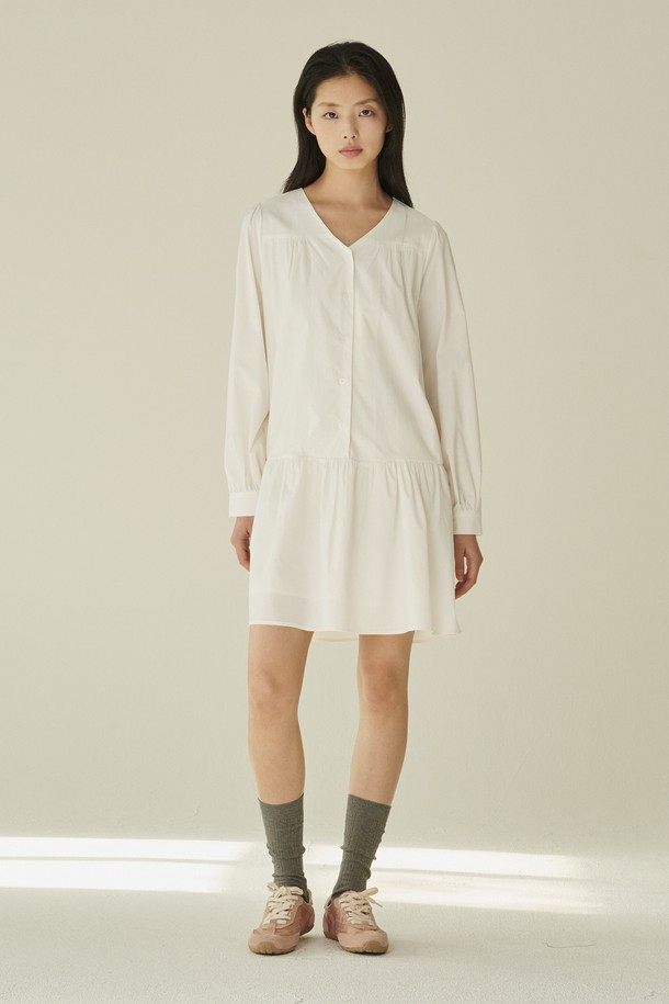 브이넥 셔링 롱슬리브 드레스 - 화이트/ V-Neck Shirring Longsleeve Dress - White