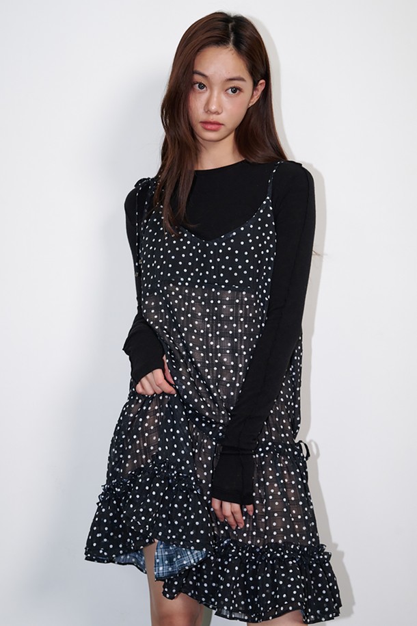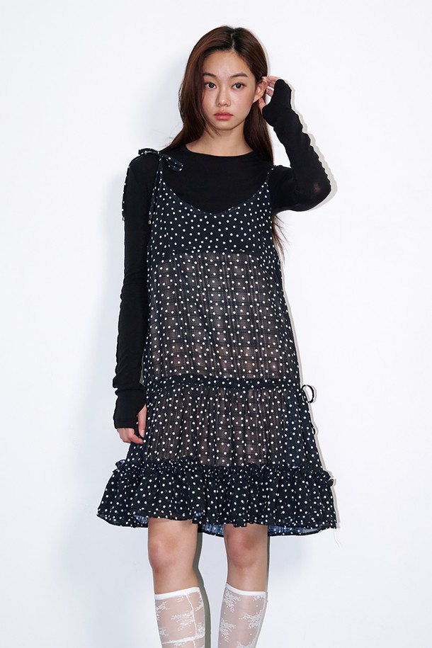 Frill shirring dot mini dress Black