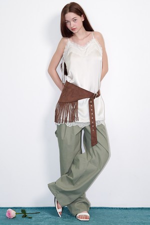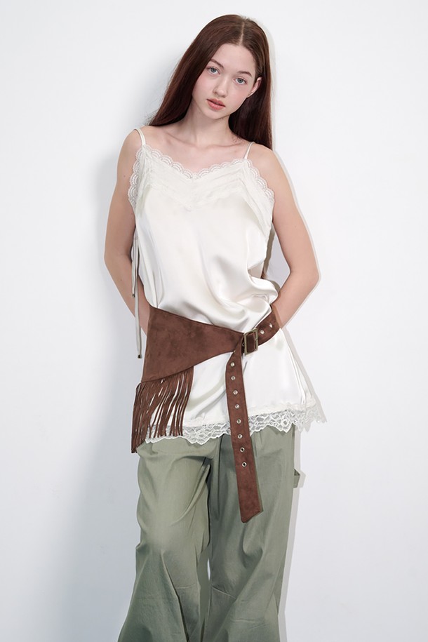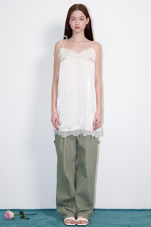 Ribbon-shoulder satin lace mini dress Cream