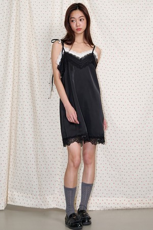 Ribbon-shoulder satin lace mini dress Black