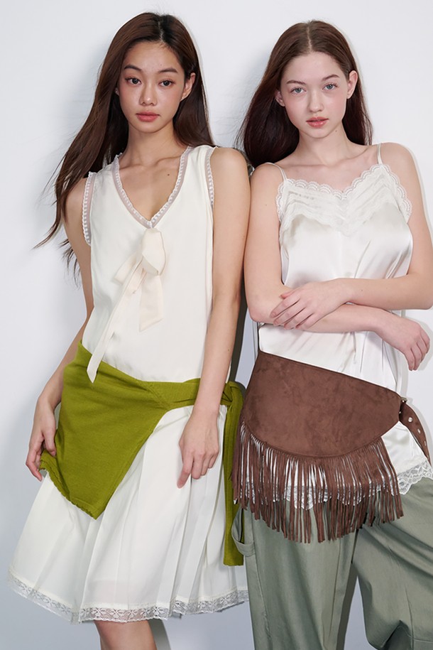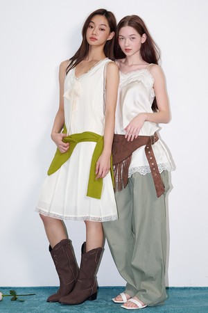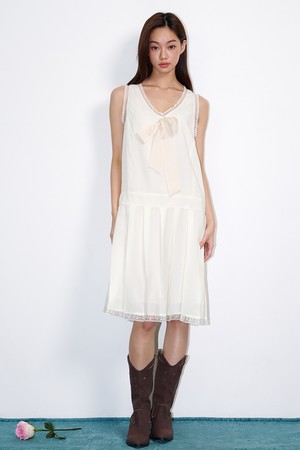 Sheer Tie Pleated Midi Dress Cream