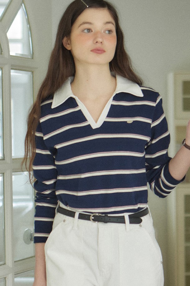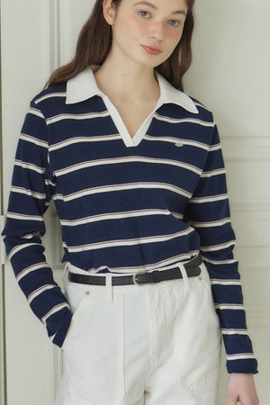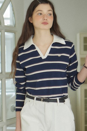Stripe Open Collar Long-Sleeve T-shirt - Navy