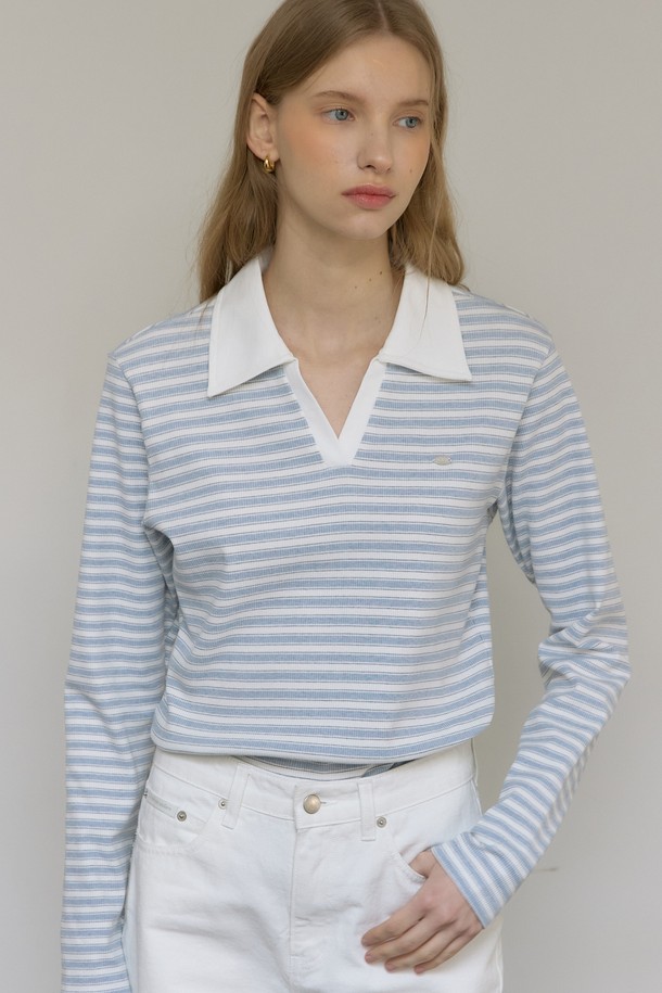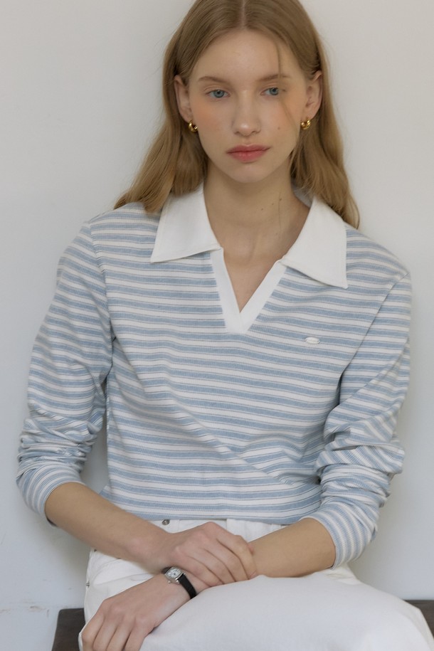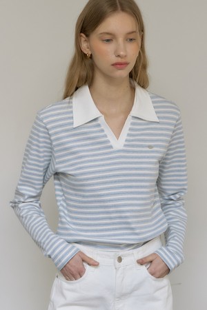 스트라이프 오픈 카라 롱 슬리브 티셔츠 - Sky Blue