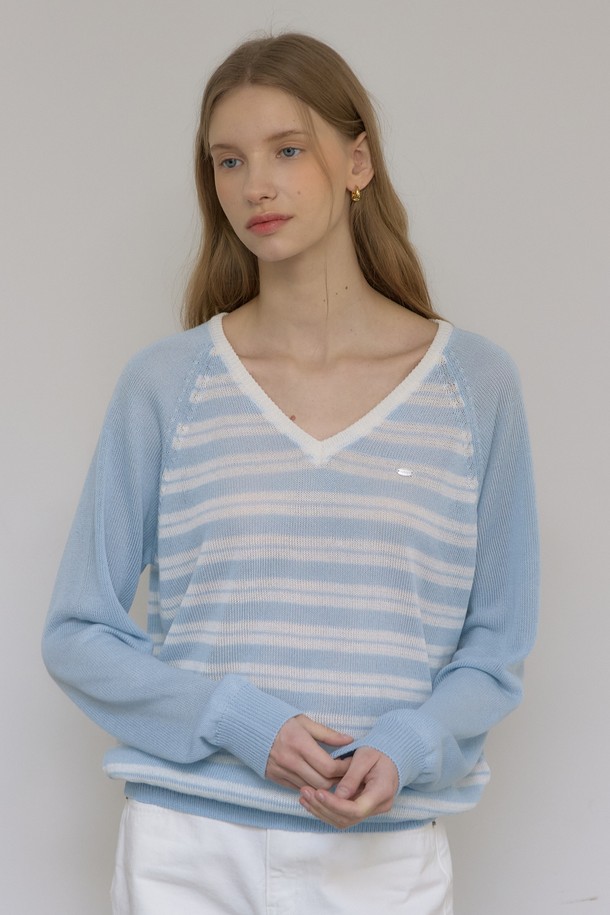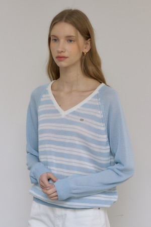 린넨 래글런 스트라이프 브이넥 니트 - Sky Blue