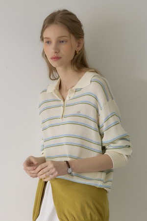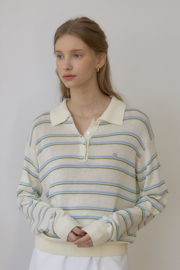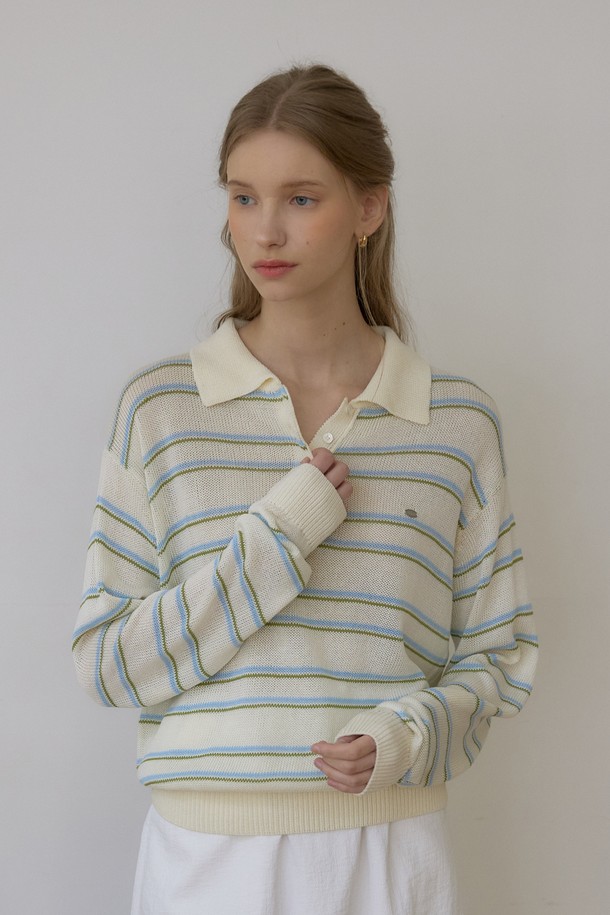 린넨 스트라이프 로고 카라 니트 - Ivory
