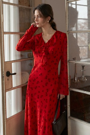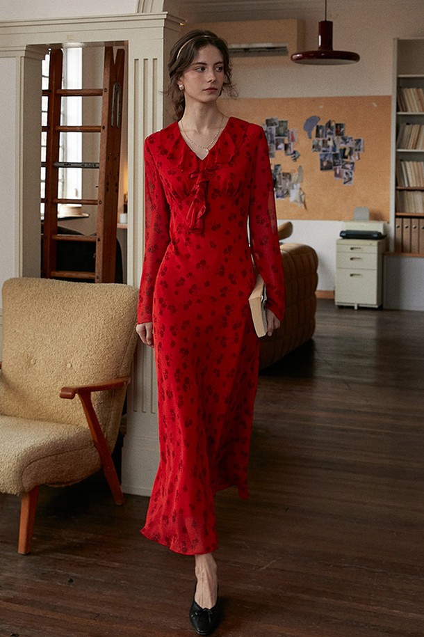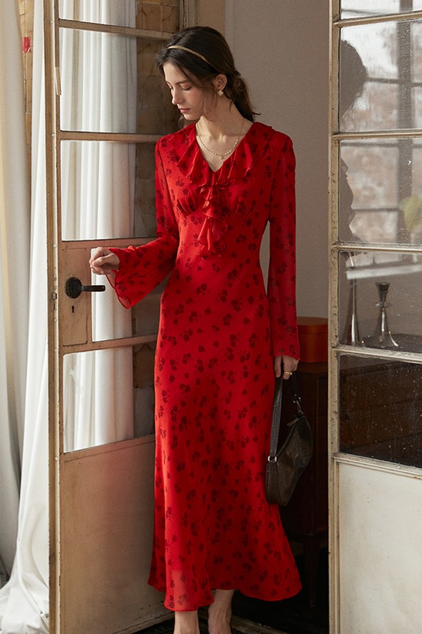 Ruffled collar long red dress