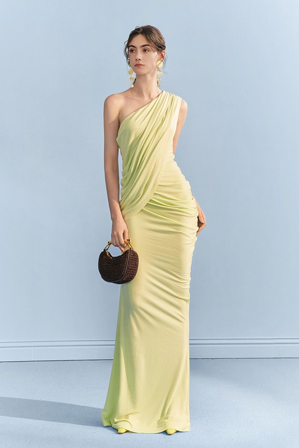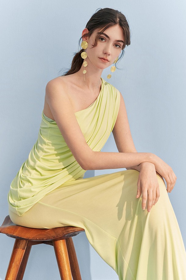 YY_Pleated slanted shoulder dress