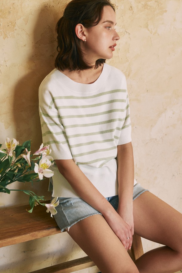 [2컬러] 반팔 스트라이프 라운드넥 니트