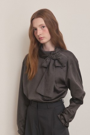 Satin side button scarf neck blouse - charcoal