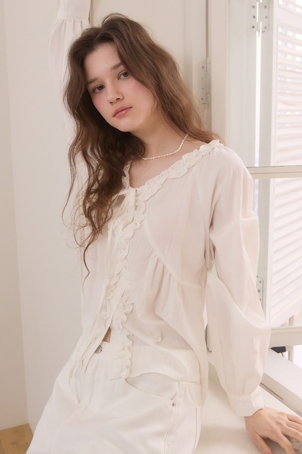 Frill line v neck ribbon blouse - white