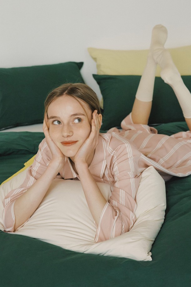 [w] 실크터치 스트라이프 원피스 파자마 세트 핑크