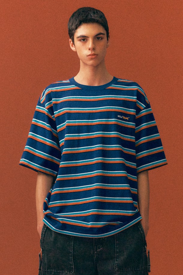 남녀공용 세미 오버핏 멀티 스트라이프 반팔 티셔츠[NAVY](UB4ST81_45)