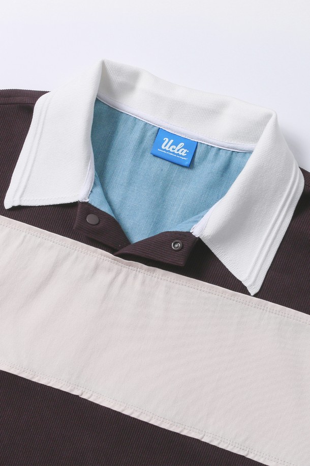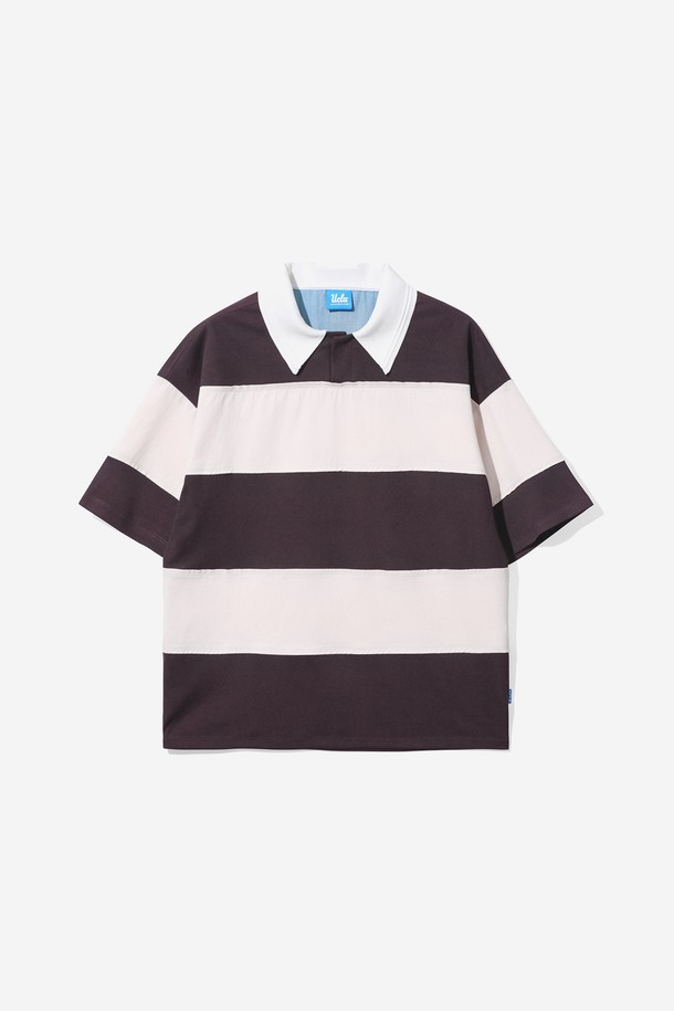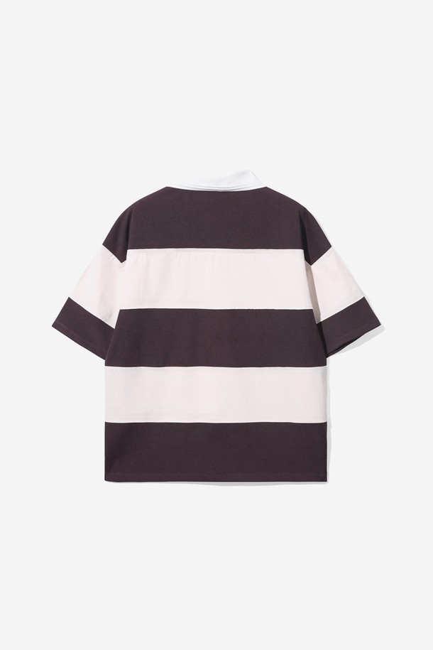 남녀공용 오버핏 럭비 스트라이프 반팔 칼라 티셔츠[DK-BROWN](UB6ST88_57)