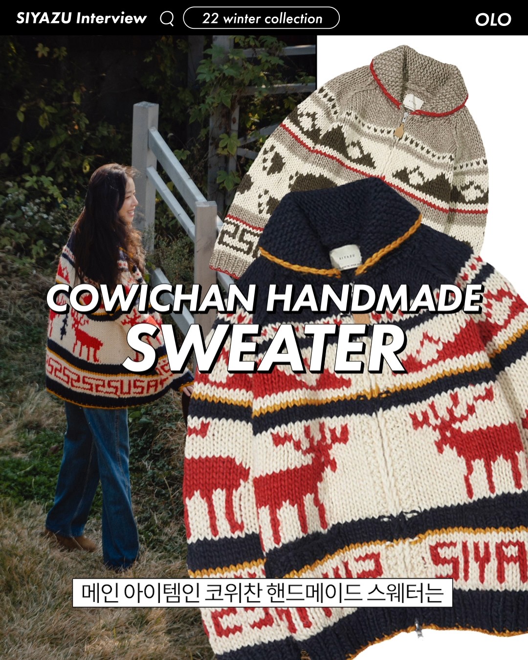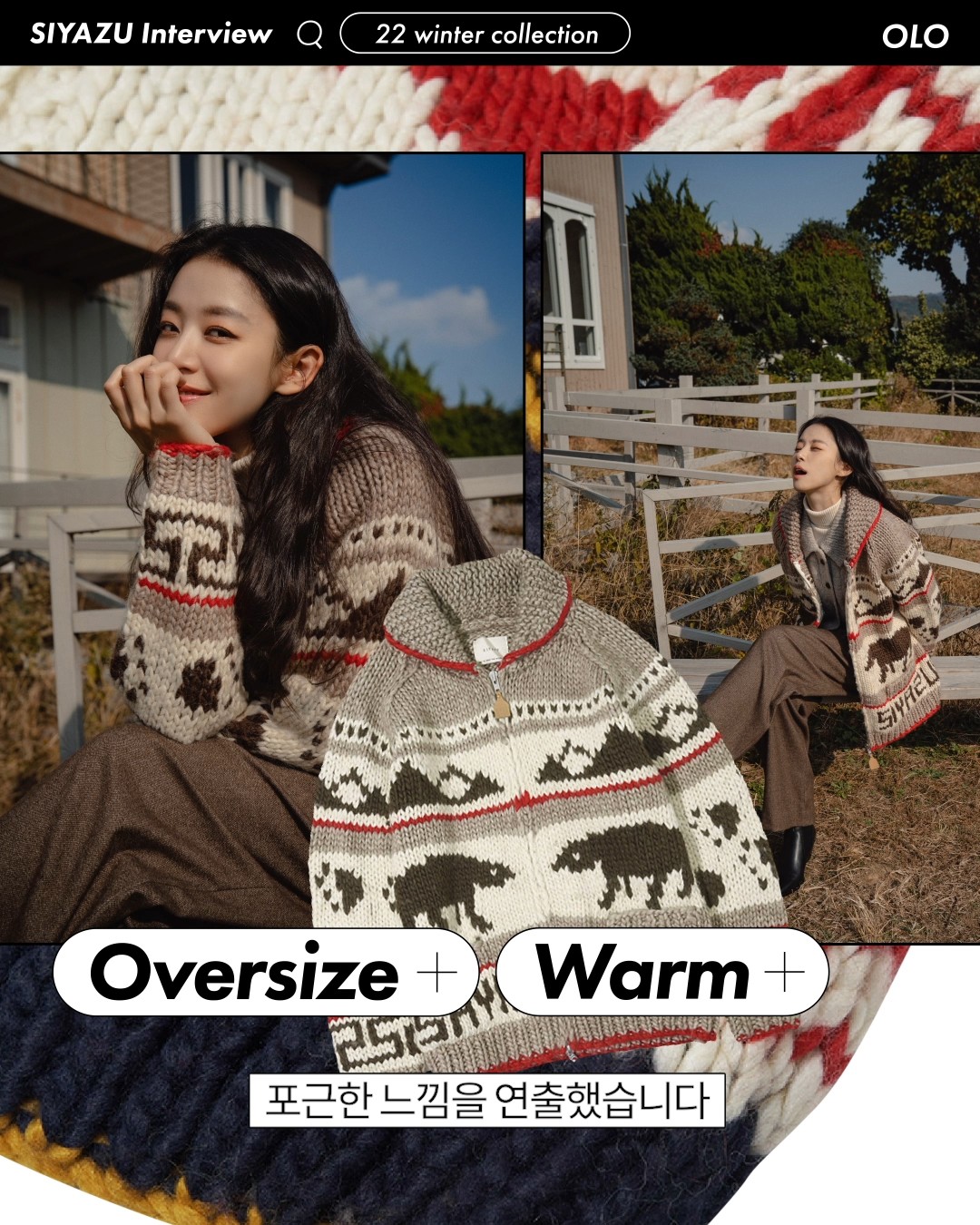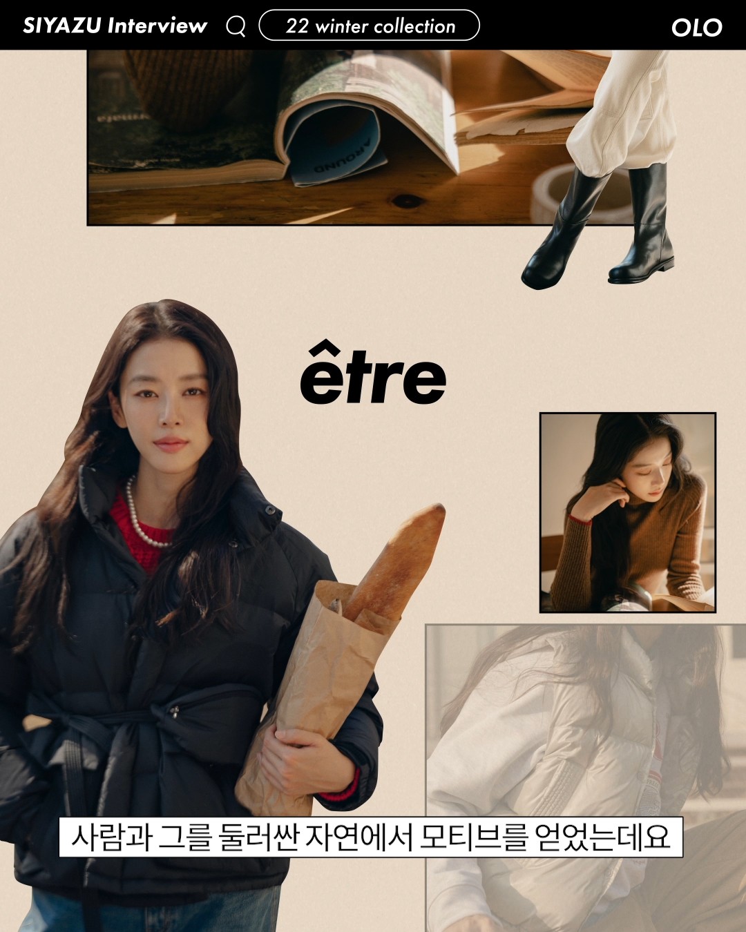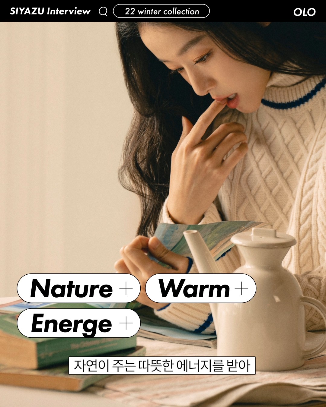 시야쥬의 22 winter 컬렉션 'être'는 사람과 그를 둘러싼 자연에서 모티브를 얻었는데요. 자연이 주는 따뜻한 에너지를 받아 도심 속에서 지친 내면을 위로하고자 하는 의미를 담았습니다. 흙, 땅, 그리고 나무가 연상되는 컬러를 바탕으로 아늑하고 편안한 무드의 룩을 연출했는데요. 메인 아이템인 코위찬 핸드메이드 스웨터는 굵직한 실과 오버사이즈 실루엣으로 포근한 느낌을 연출했습니다. 마치 목장 위를 자유롭게 거니는 소녀의 모습이 떠오르지 않나요?