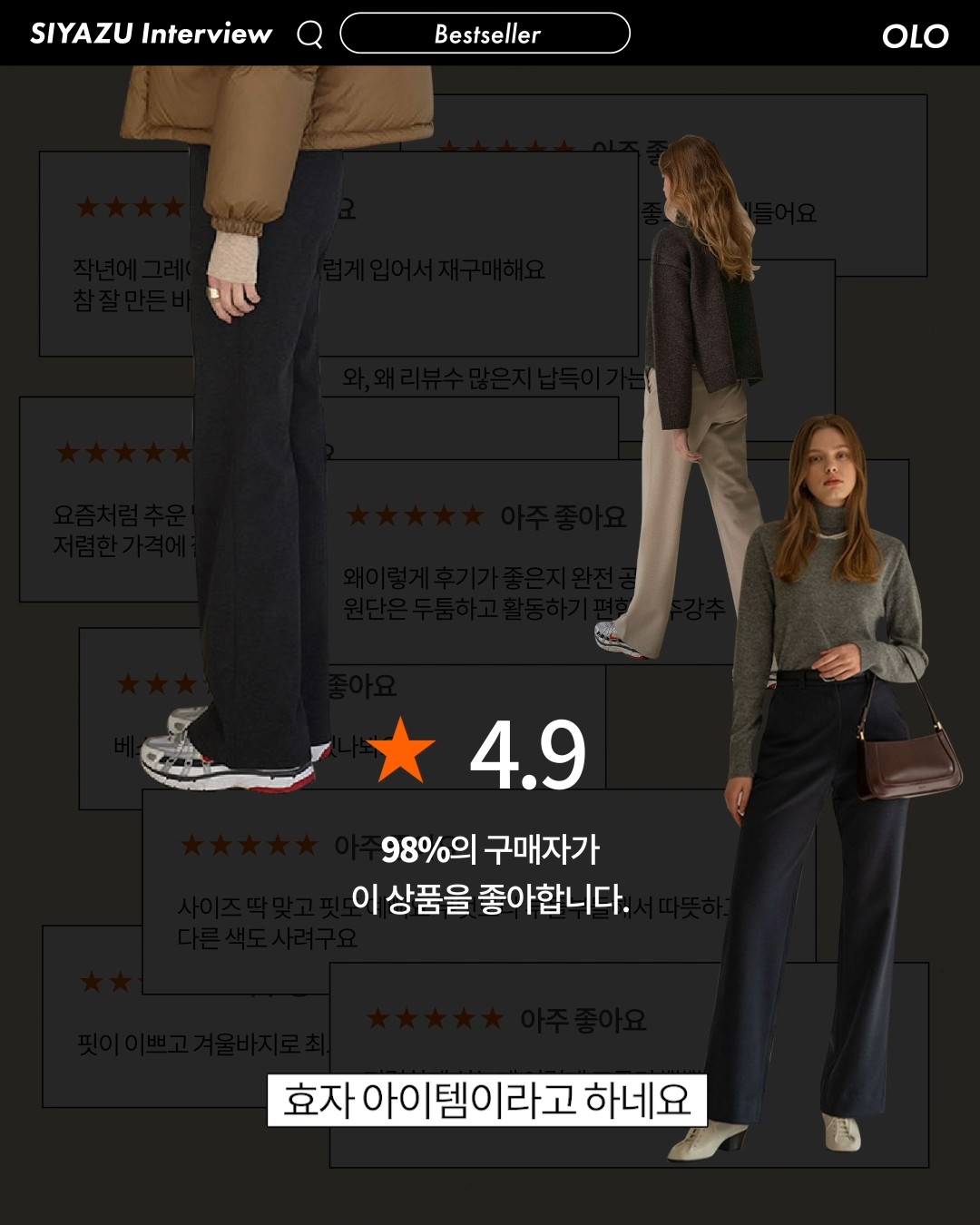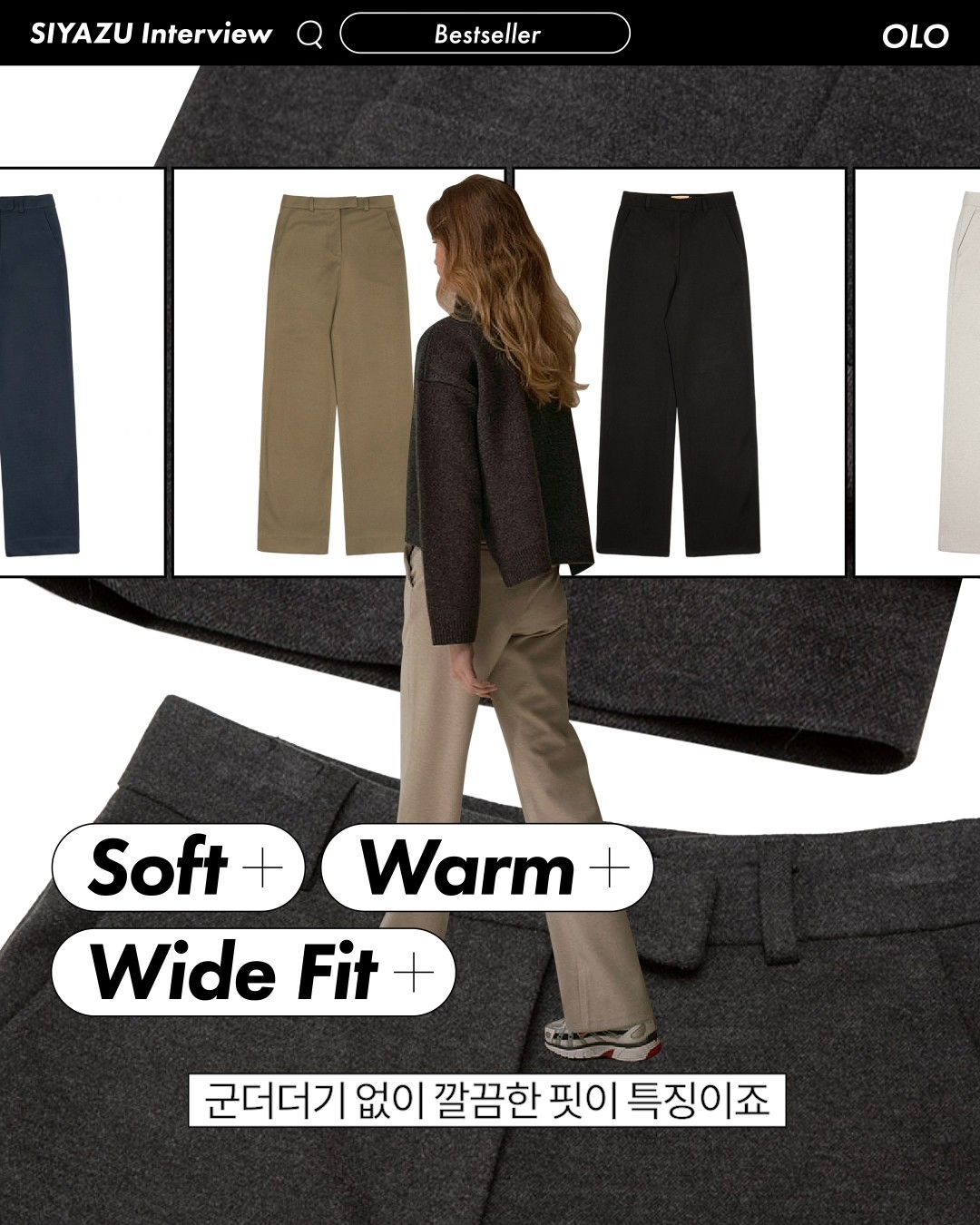 시야쥬를 입소문 나게 만든 베스트셀러 아이템도 바로 슬랙스! 바로 SI PT 7021 더블 위브 롱 와이드 슬랙스인데요. 기모가 살짝 올라온 부드러운 촉감에 군더더기 없이 깔끔한 핏이 특징이죠. 디자인이 베이직하고 편해서 누구나 착용하기 좋은 제품이라고 합니다. 이 제품이 바로 3만 장 이상 판매되어 시야쥬를 ‘바지 맛집'로 알려지게 한 효자 아이템이라고 하네요.