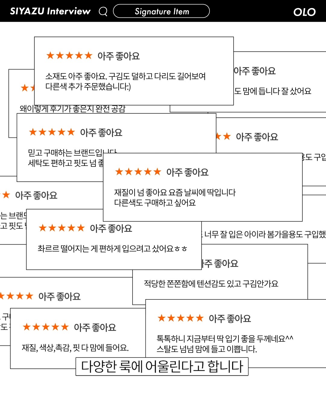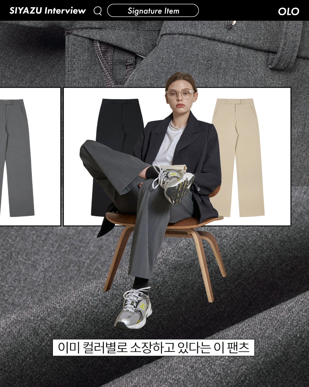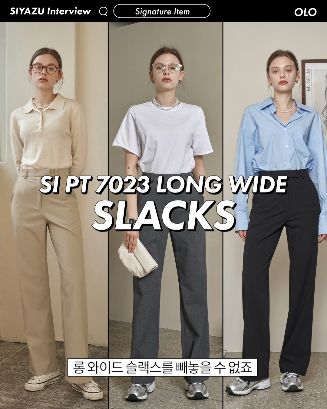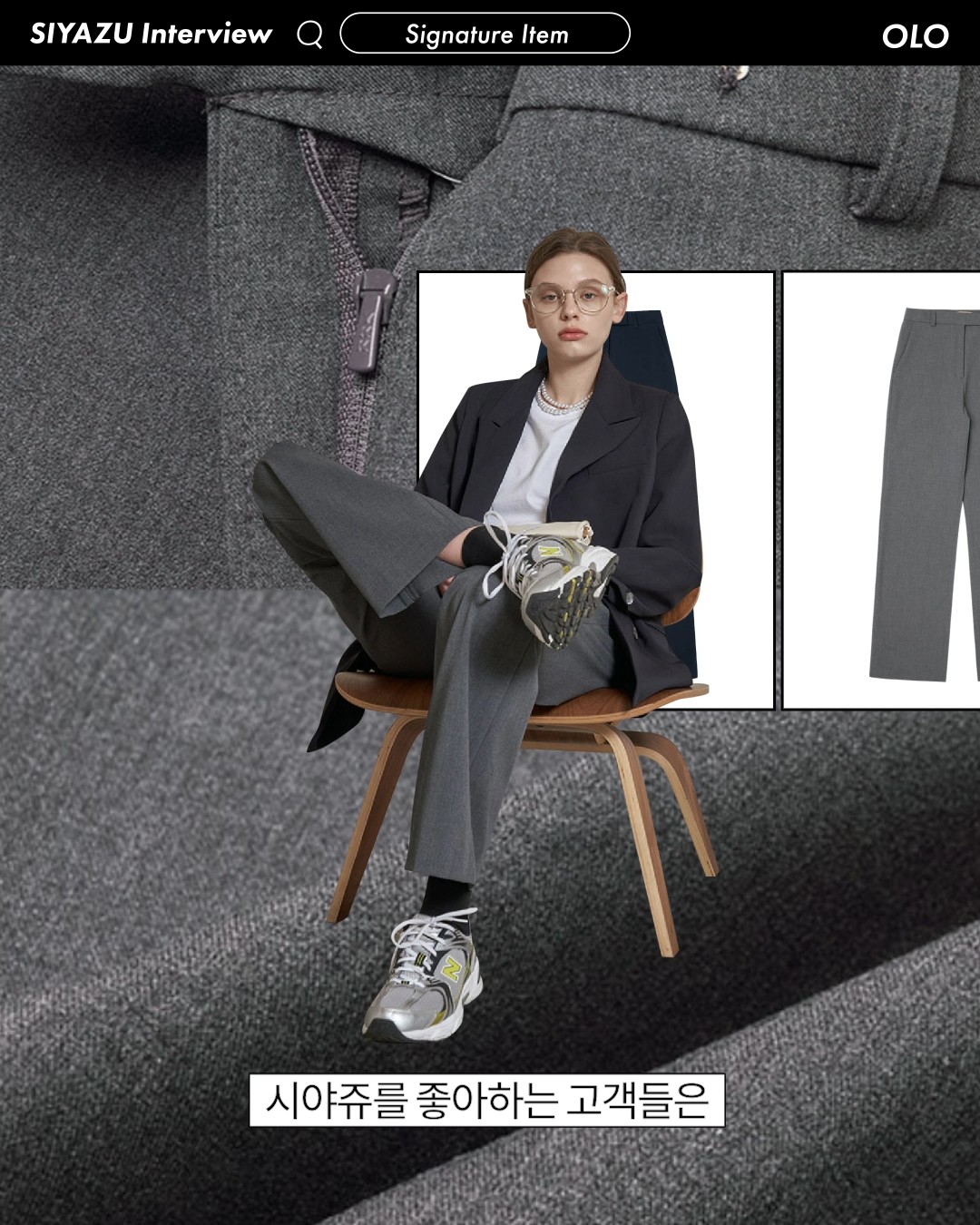 지금까지 발매한 제품 중 가장 ‘시야쥬’스러운 아이템을 꼽는다면, SI PT 7023 롱 와이드 슬랙스를 빼놓을 수 없죠. 시야쥬를 좋아하는 고객들은 이미 컬러별로 소장하고 있다는 이 팬츠. 슬림해 보이면서도 편안한 착용감까지 갖추어 다양한 룩에 어울린다고 합니다. 누구나 쉽게 매치하기 좋은 실용적인 아이템이야말로 시야쥬가 잘하고 있고, 앞으로도 잘하고 싶은 아이템이라고 하네요.
