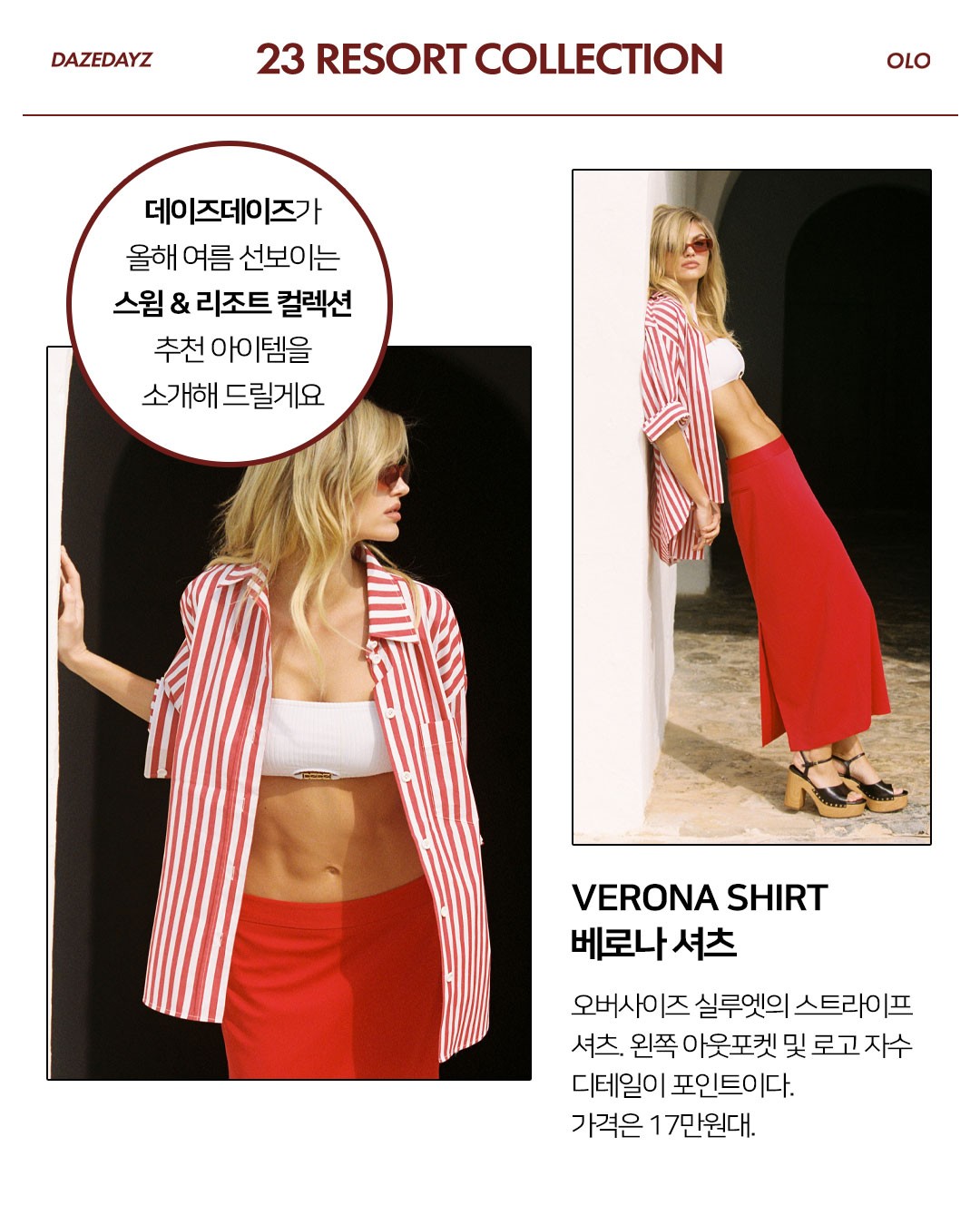 이번 여름, 데이즈데이즈가 선보이는 컬렉션의 이름은 “Isla Del Sol”. 스페인어로 태양의 섬이라는 의미인데요. 지중해의 아름다운 섬, 이비자에서 입고 싶은 90년대 제트 셋 룩과 트로피컬 아일랜드, 하와이를 닮은 컬러풀한 스윔웨어를 선보였습니다. 가장 추천하고 싶은 키 아이템은 바로 CARMEN SILKY PANTS와 VERONA SHIRT. 구김이 잘 가지 않는 가벼운 소재라 수영복 위에 걸치면 멋진 여행 룩을 연출할 수 있답니다.