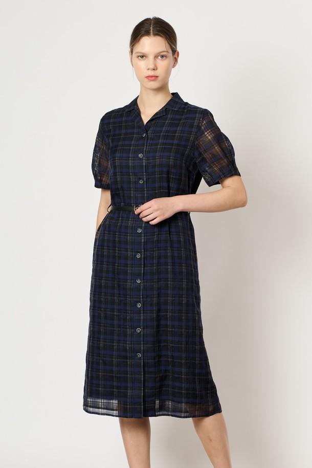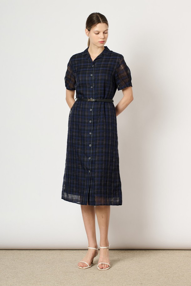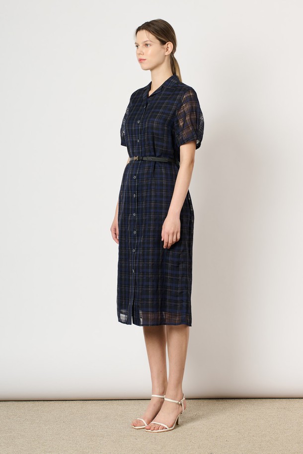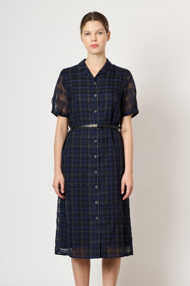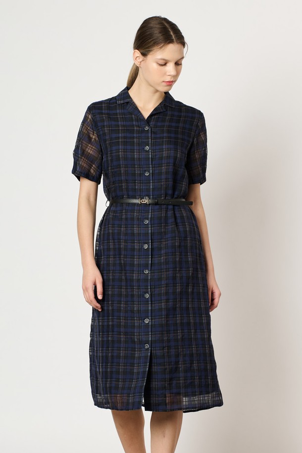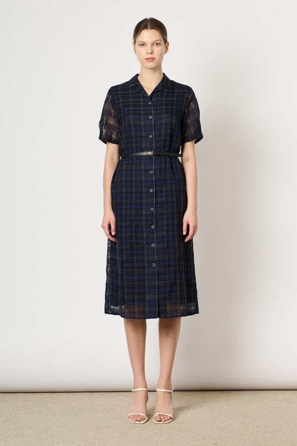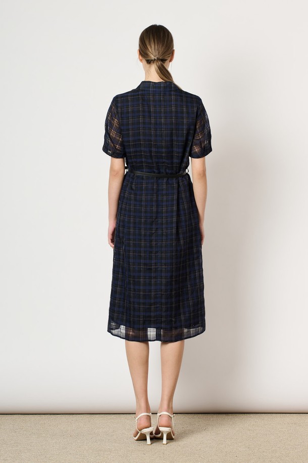 [24SU]오픈카라 체크 벨티드 원피스 - Navy B4M6O66055