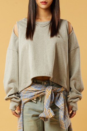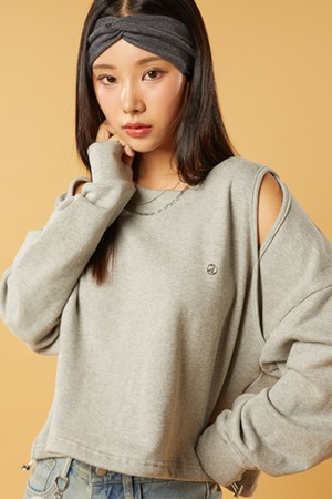 [워머 ver.] 크롭 더블 컷아웃 오프숄더 니켈 로고 맨투맨 [그레이]