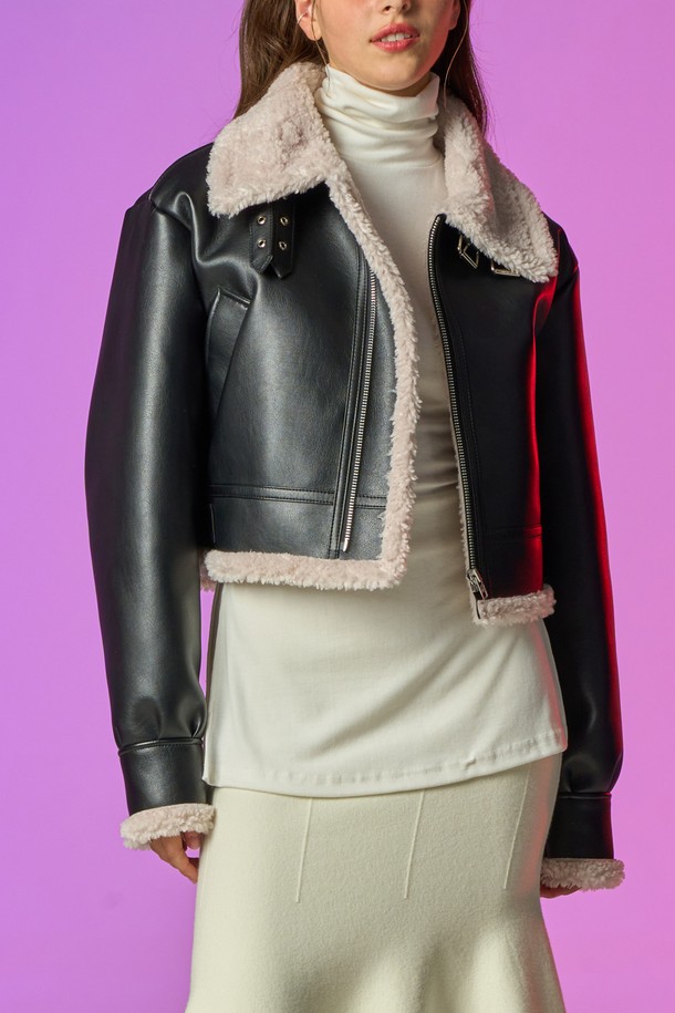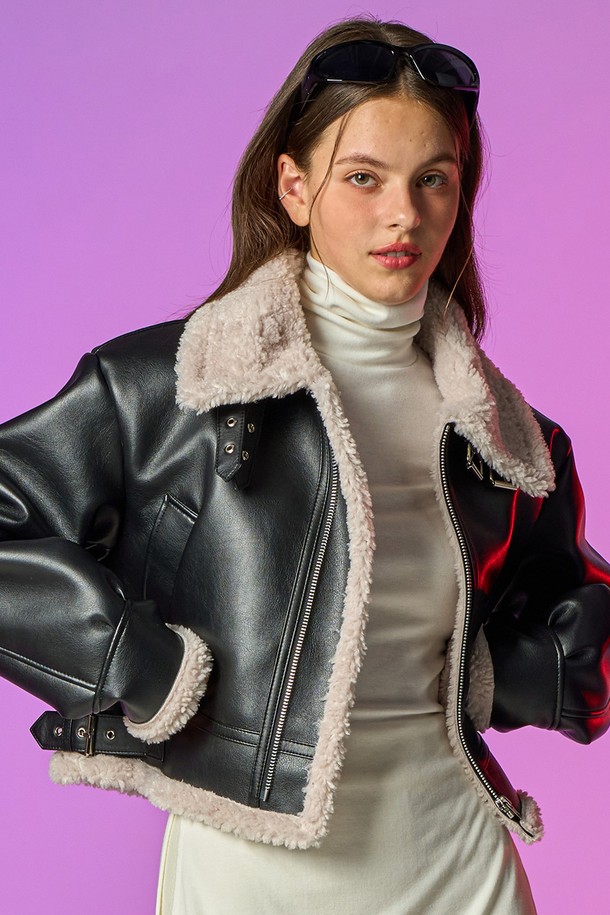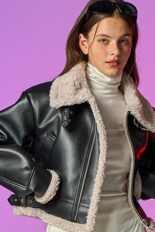 [크롭 ver.] 블러드 셔링 양털 플리스 레더 무스탕 자켓 [Black_Beige]