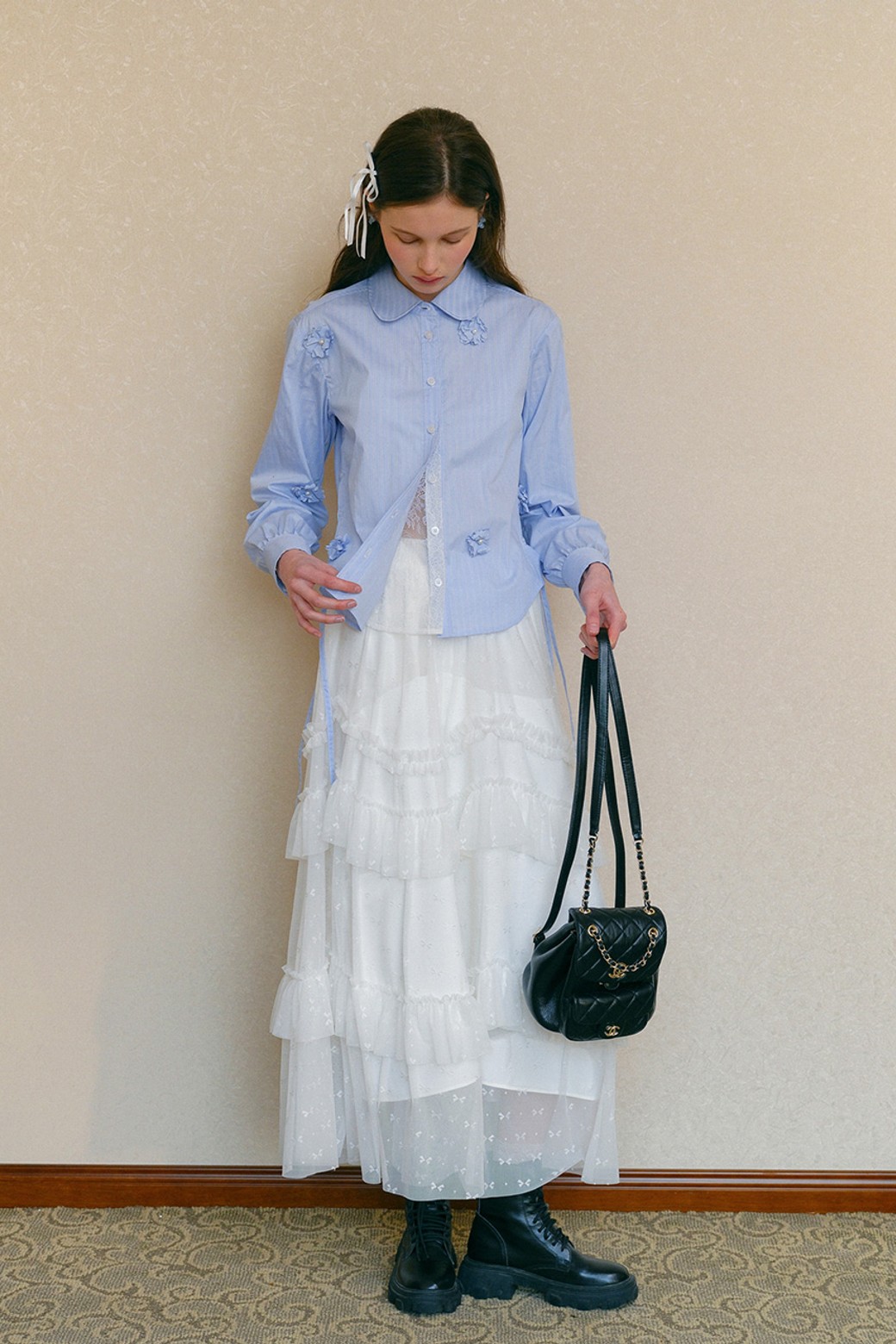Cest_Beaded flower striped shirt