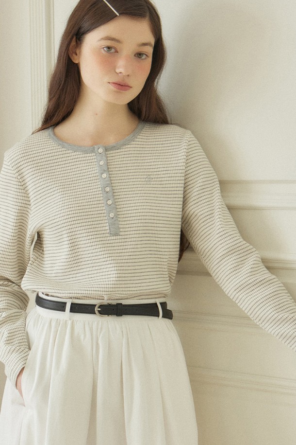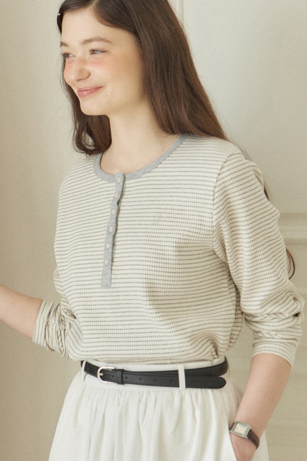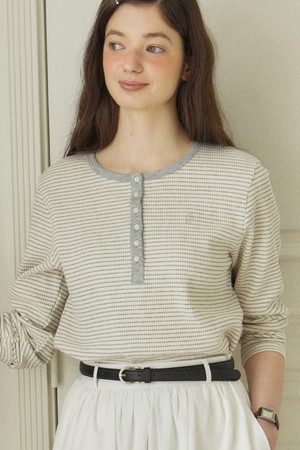 Logo Henley Neck Stripe Sleeve T-shirt - Grey