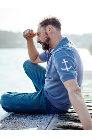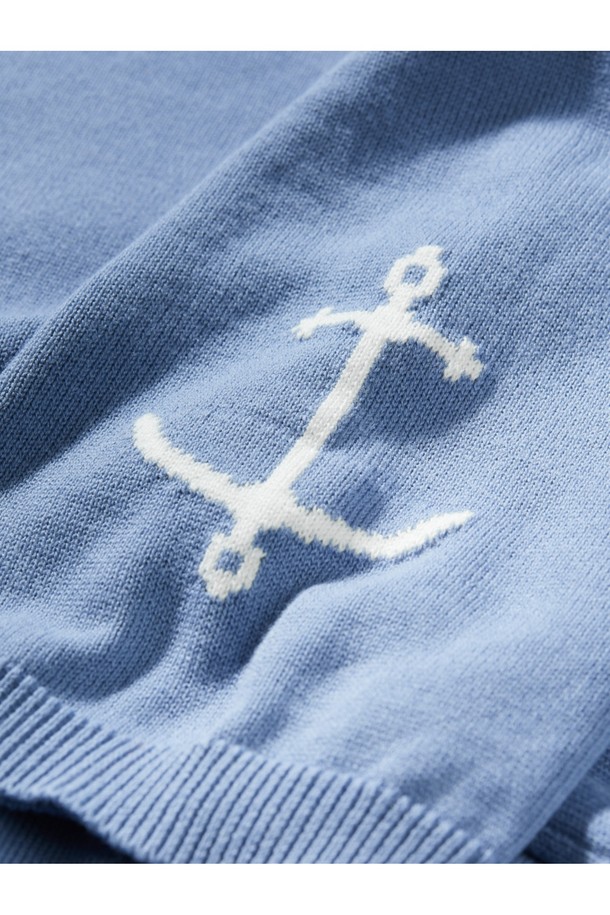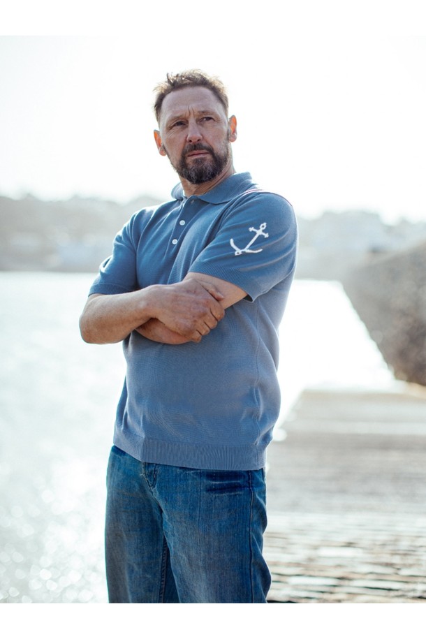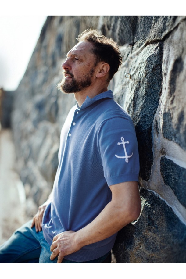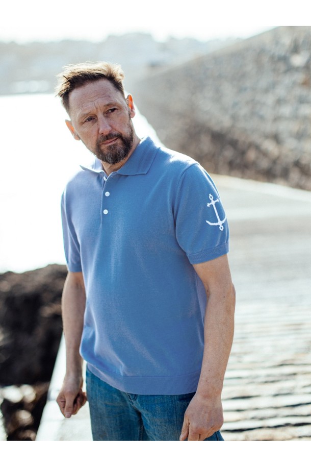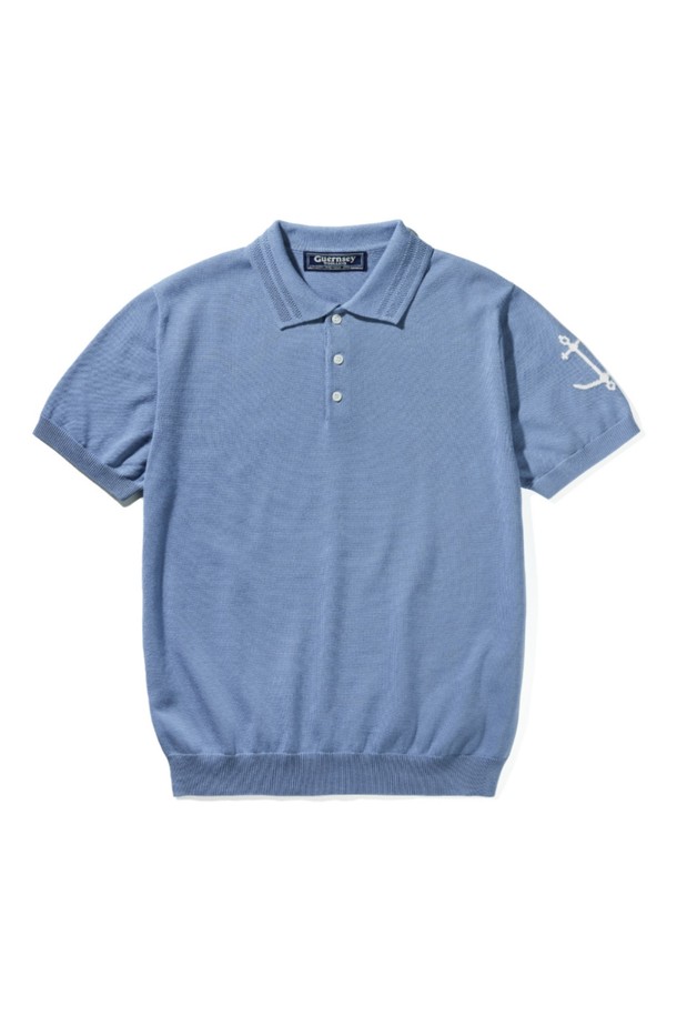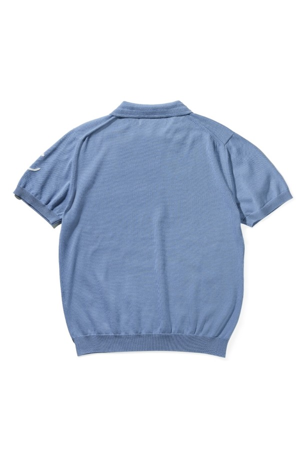 코튼 반팔 카라 니트 - 블루