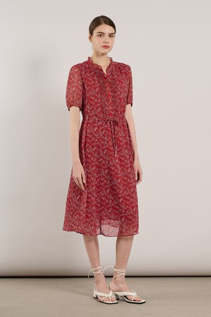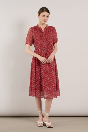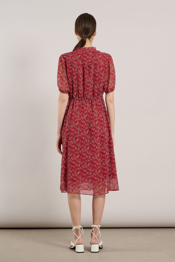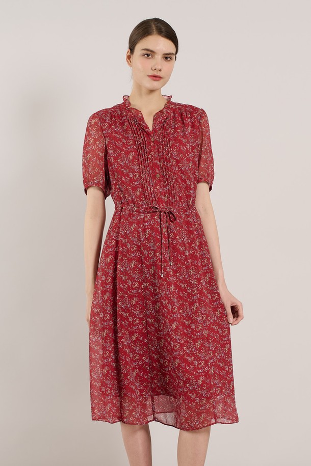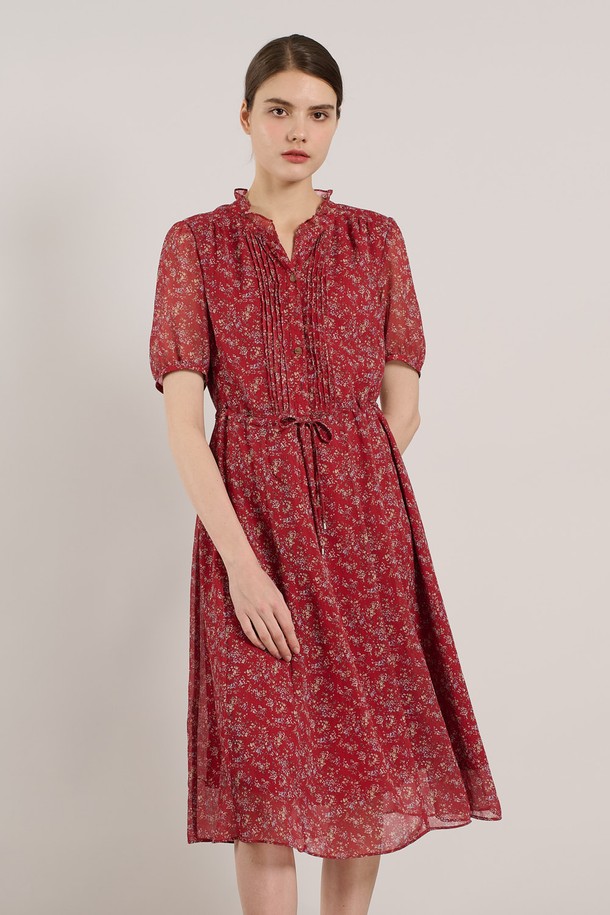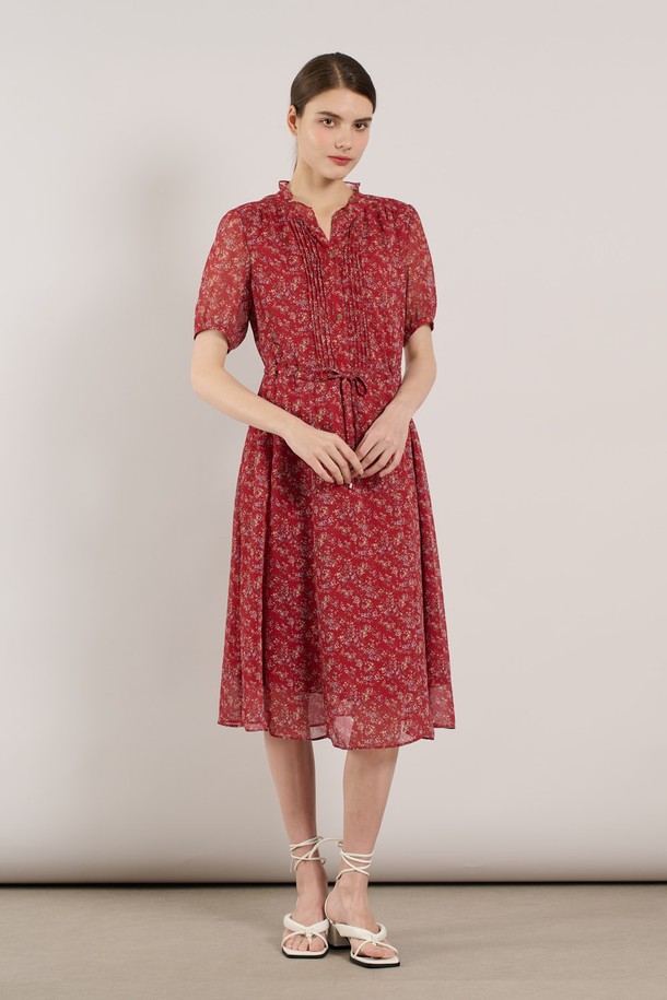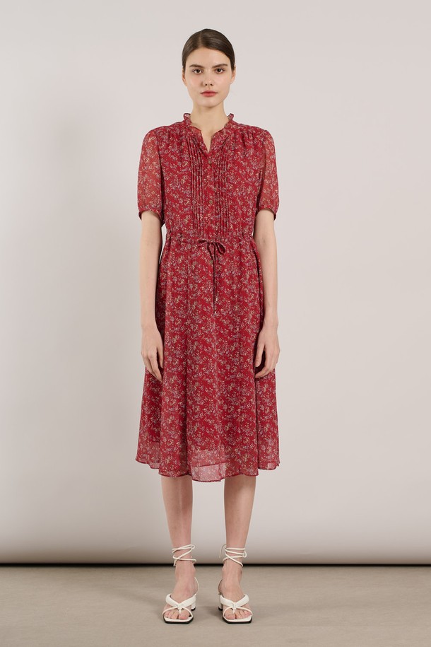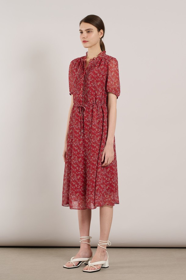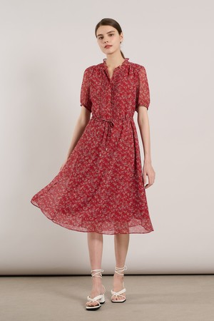 [25SU] 네크 훌 핀턱 프린트 쉬폰 원피스 - RED A5M3O67324