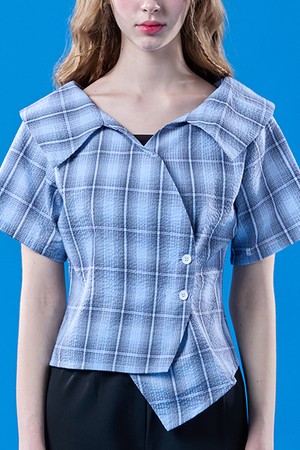 여름 휴양지 랩 오프숄더 체크 쿨링 슬림 반팔셔츠 [BLUE]