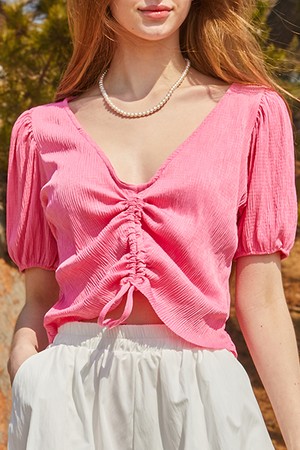 쿨링 플리츠 리본 퍼프 크롭 반팔티 [PINK] 브이넥 ver.