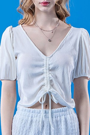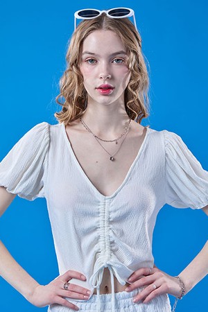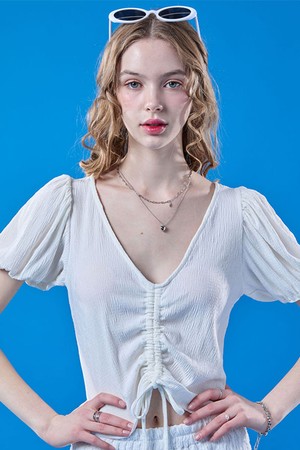 쿨링 플리츠 리본 퍼프 크롭 반팔티 [WHITE] 브이넥 ver.