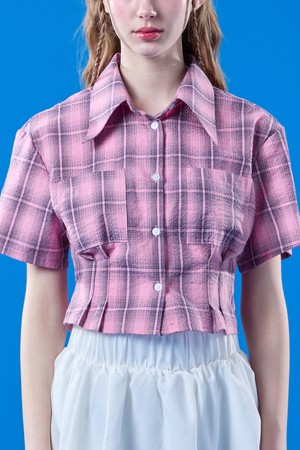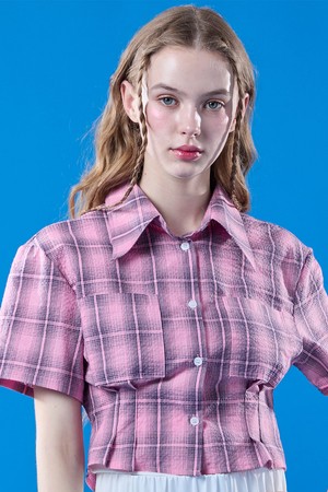 여름 휴양지 체크 쿨링 슬림 크롭 반팔셔츠 [PINK]